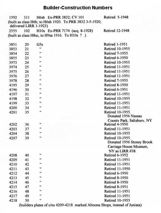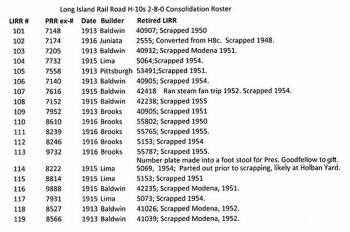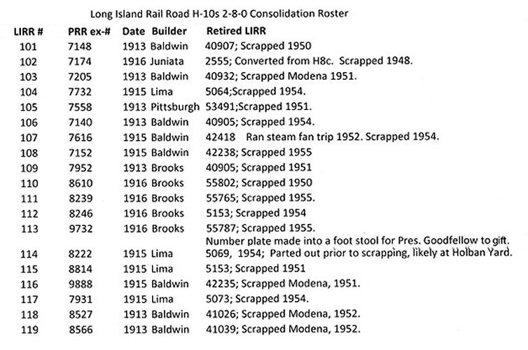 | The LIRR acquired their H10s engines from the Pennsylvania Railroad between 1928 and 1930. Only one H10s that the LIRR owned was built by the PRR, however ALL were previously OWNED by the PRR and were assigned PRR road numbers. Research: Dave Keller | ||||||