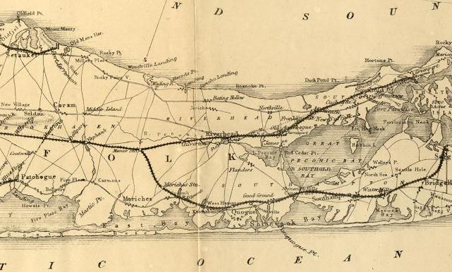 . As shown on this 1879 map there was no railroad line running east of Patchogue.