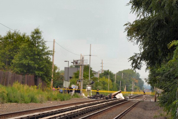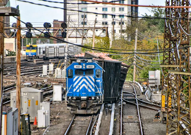YA train configured with power at the west end, loaded construction debris cars at the head, followed by empty aggregate hoppers, followed by about 5 more loaded C/D cars. The last two cars were on the ground, with the first upright and still attached to the end of the train, and the last tipped northwards off it's trucks, with the trucks right in the vicinity of Divide 1-21 crossover. LIRR had an almost inconceivably high number of people on the ground. Very quick response.
