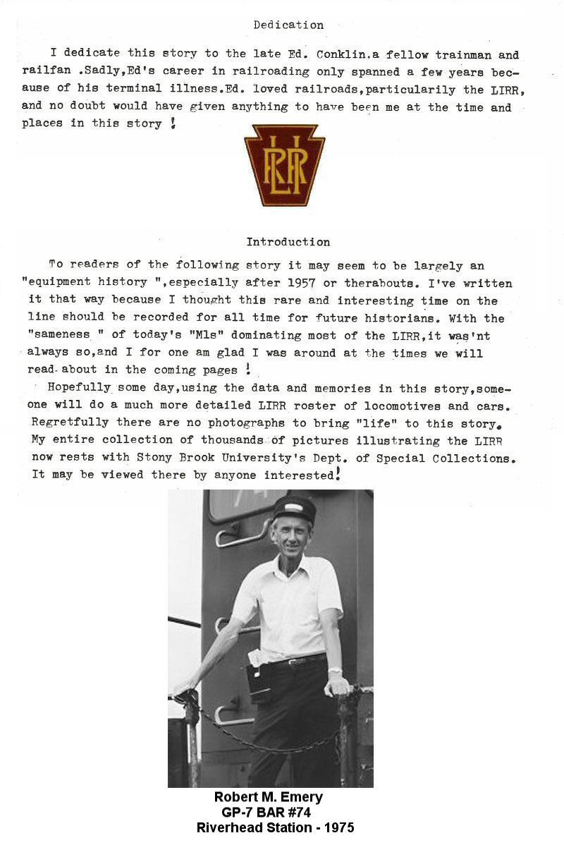 is posted.He joined the Long Island Rail Road in 1943 and retired in 1976. His first job after graduating from Mattituck High School, NY was as a trainman; he was a conductor at the time of his retirement. In 1976, Stony Brook University acquired, through purchase, his extensive collection which documents the history of the Long Island Rail Road (LIRR) equipment and operations during his tenure with the railroad, via photographs and maps. The following document is his 268 page journal outlining his early years and "...thirty three and a 'little bit more' as an employee..." journey as he wrote it down. It is broken down into chapters, by year, for ease of the reader to follow along on his journey. The photos and captions, I have provided, are from my website to further help illustrate the Emery Journal. Due to the number of pages/photos the yearly chapter pages are combined into a pdf file to facilitate downloading and reading. |
