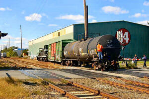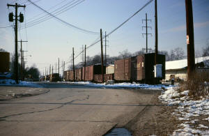 Islip team track (ex-Freight House house track) boxcar for 84 Lumber