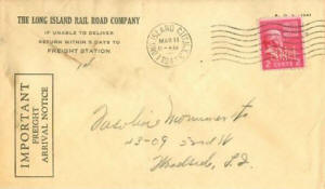 Freight arrival postal card notice sent from LI City to Woodside for local