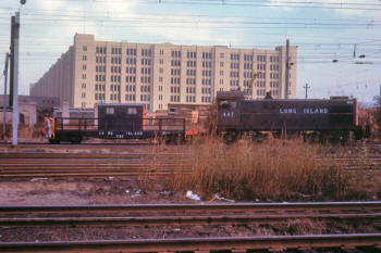 LIRR# 416 with Idler 4 stanchion car - LI City view W 1976 |