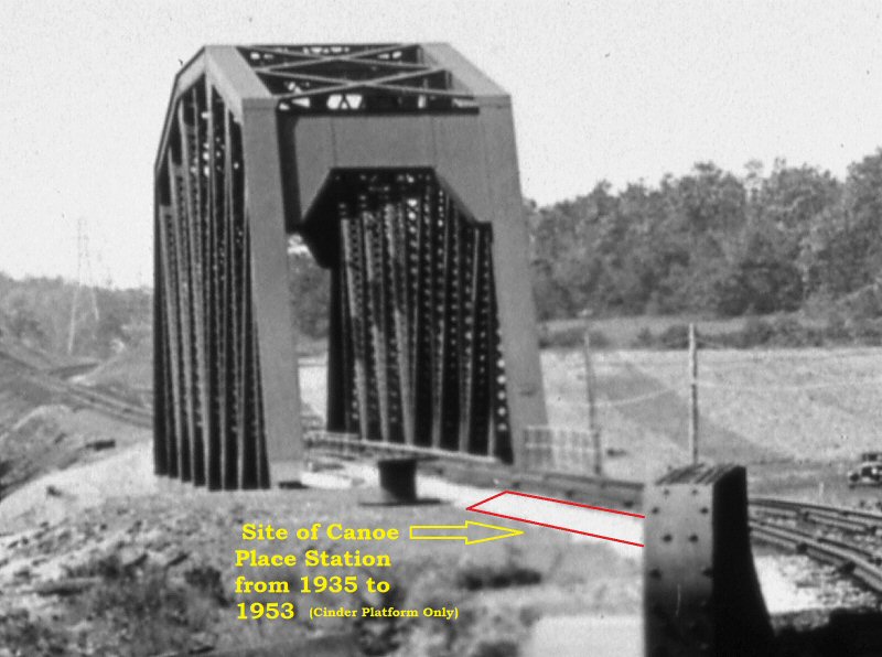 ![]() In this close-up of the previous 1931 view, the approximate location of the Canoe Place station is indicated. This was a low-level, crushed cinder platform only and was a scheduled stop for fishermen from 1935 until 1953 when "Fisherman's Specials" were discontinued and the stop was removed from the timetable. |