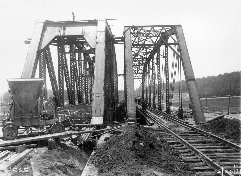 ![]() View east with the older iron railroad bridge at the left and the heavier replacement "K4 bridge" at the right on May 26, 1931. (Dave Keller archive) |