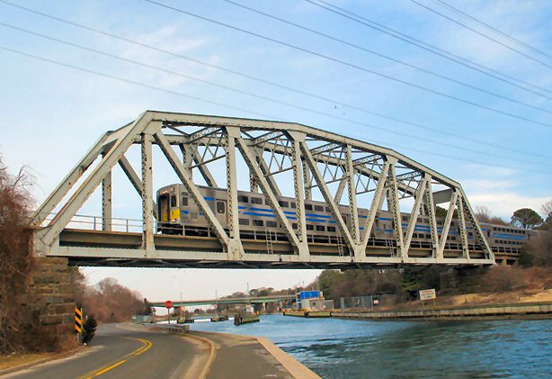 Prior to this bridge being placed in service, PRR-leased K4s class locomotives did not pull Hamptons/Amagansett/Montauk trains as the older bridge couldn't support the locomotive's weight; however two G5s class locomotives double-heading WERE allowed to make these runs. After the new bridge was placed in service, K4s locomotives regularly pulled these trains, hence the given nickname "K4 bridge." The K4s locomotives were returned to the parent road in 1950. Info: Dave Keller | ||