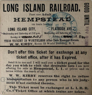 ![]() Ticket from Flatbush Ave. to Hempstead 11/05/1893 W. W. Kirby pass to review real estate lots for sale. |