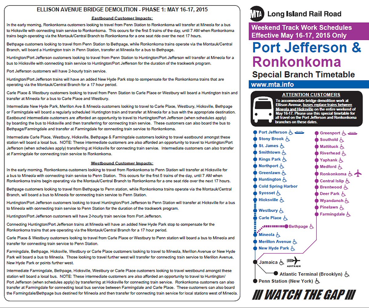![]() Port Jefferson & Ronkonkoma Special Branch Timetable - Ellison Ave. Bridge Demolition - 5/16-17/2015 Only May 2015 weekend suspension for bridge demolition at Ellison Avenue: the main line severed for one weekend between Mineola and Hicksville with all Ronkonkoma service via Babylon and shuttle service on the Port Jefferson Branch east of Hicksville and connecting buses between Mineola, Hicksville and Bethpage. Info/Archive: Kevin Wong |