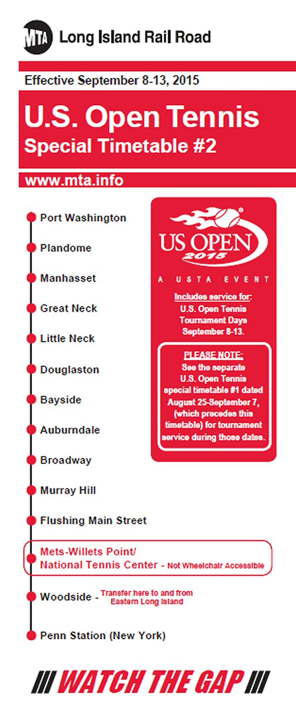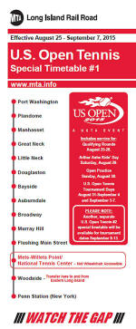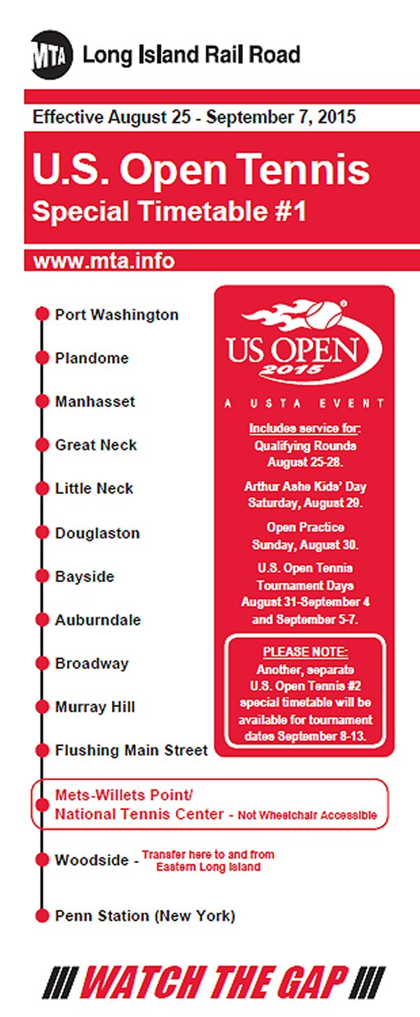 ![]() US Open Tennis Special Timetables August 25-September 7, 2015 - September 8-13, 2015 Archive: Kevin Wong |