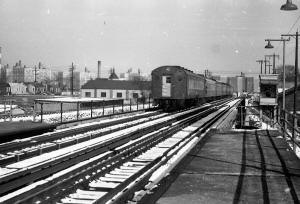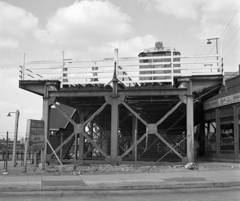 ![]() Old station with train on elevated viaduct. View N c. 1955 (W. J. Edwards photo, Dave Keller archive) |
