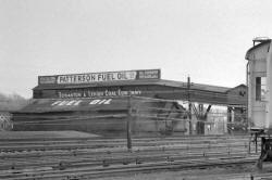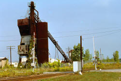 a We see in some of the later pictures, the lifting device is no longer installed, because the silos are no longer used, which leaves how they worked something of a mystery to those who only saw these at the very end. Just a side note: Most consumers HATED their coal dealers, because they always thought they were getting cheated. It's hard to confirm the measure of coal purchased (and put in the cellar via a chute off the coal delivery truck) -- Who's to say that "ton" was really 2,000 pounds or maybe 1700 pounds? The "exact" measurement of oil from an oil delivery truck (and county bureaus of weights and measures to confirm their accuracy) is a legacy of that era in many ways, and is one of the major reasons people switched to oil the moment it became available. The other reason was that the coal furnace was either on or off -- burning anthracite or not. Oil was "instant on" and "instant off" -- which was another advantage. You usually see a chute partway up the silos (or what looks like a boarded up window after the silo was no longer used <g>).. That's where trucks were loaded to make their deliveries. The wooden storage buildings like the Heffner would have a place for carts (later trucks) to unload beneath each bin. There were also concrete versions of this -- big oblong buildings similar to those made of wood. There are lots of variations on a theme. Some of these outfits used open air storage -- simply with a trestle -- and maybe had trucks pull up under the trestle and have coal loaded directly. More often, the coal would be dumped below the trestle, and a portable loader put into the coal pile to lift it and dump it into nearby trucks. Dieckel on the West Hempstead Branch seemed to take "live" real time deliveries after the Valley Stream Grade Crossing Elimination eliminated their siding -- another variation -- and perhaps unique. Can someone confirm that? The