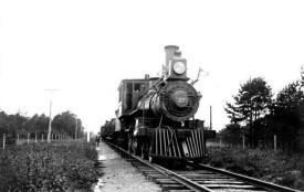 The shot of the train was taken by Harold Fullerton in 1897 along the Main Line at Medford. It was called Patchogue Path and was a bicycle path through the pine barrens, running from Patchogue, through Medford and on to Port Jefferson. The view is north.