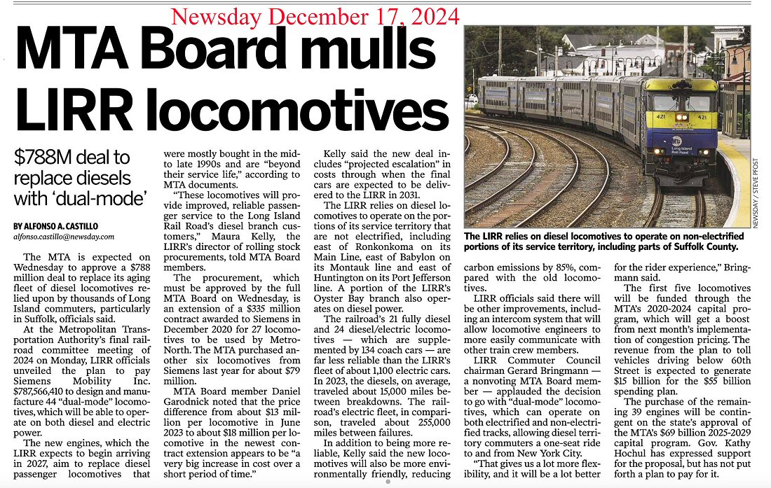 Newsday - MTA Board mulls LIRR Locomotives - 12/17/2025