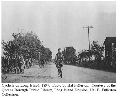 the rear-wheel-driven bicycle, resulted in a national surge in cycling, and Long Island was a center of the new craze. The Island was ideal for bicyclists because it offered pleasant roads through wooded areas as well as seashore trails. Bicycle clubs were formed “in practically every village on the Island.” In 1896, there were forty-seven cycling associations in