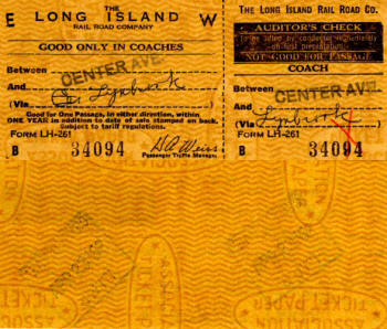 The Island Park office was closed in 6/1946. The ticket purchased was printed during the GPA: Homer Bannard era 1946-1948 when the office had been open sometime during that period. The station building was constructed prior to 1946, with a ticket office. Chances are, after the agency closed in 1946, the development in the area led to increased ridership (look at post-war Levittown) and the ticket agency may have possibly reopened in 1947 or 1948. I do know the agency was indicated as "open" in the list of station ticket office hours that I have dated to 1955. Note: The pre-printed ticket with two stops: Island Park and Center Avenue, was very odd for those two stations due to their proximately. Blank stock would normally have been used. Chances are, when the LIRR decided to re-open the agency, they tried to use up the already pre-printed ticket stock, rather than destroy all the older stock. Info: Dave Keller |