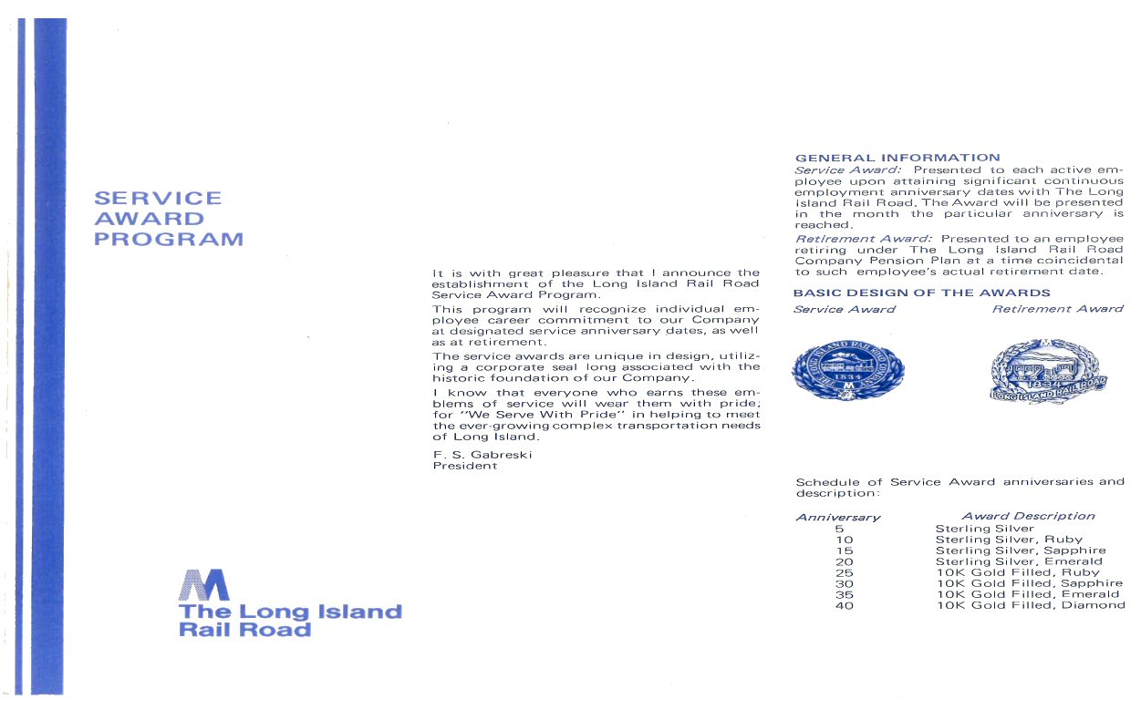"It is with great pleasure that I announce the establishment of the Long Island Rail Road Service Awards Program. This program will recognize individual employee career commitment to our Company at designated service anniversary dates, as well as at retirement. The service awards are unique in design, utilizing a corporate seal long associated with the historic foundation of our Company. I know that everyone who earns these emblems of service will wear them with pride for "We Serve With Pride" in helping to meet the ever-growing complex transportation needs of Long Island" - F. S. Gabreski, President (1978-1981) Material presented here courtesy of: RMLI - Mike McEnaney, Research