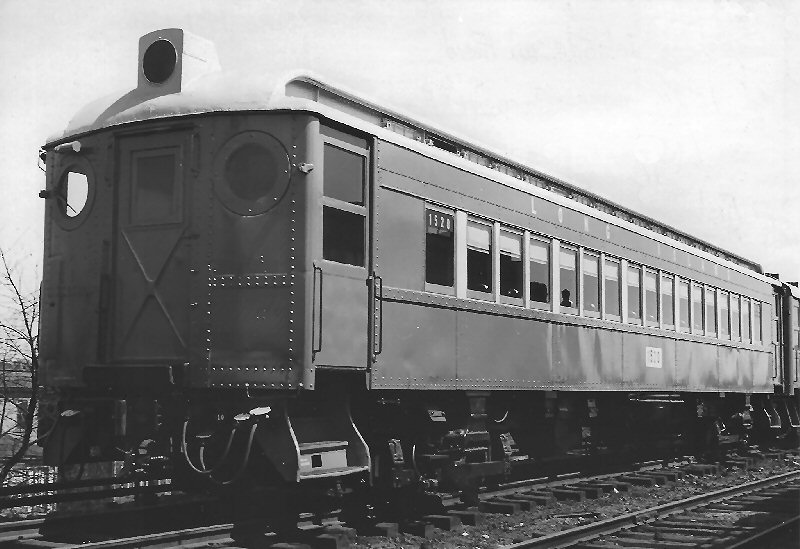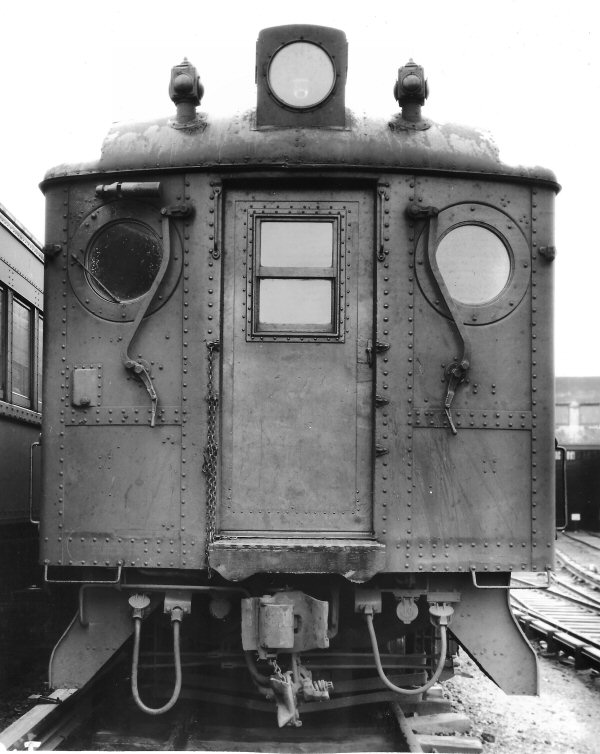 #1379 had the passenger end of the car photographed on November 9, 1933. There were subtle differences in the end details of headend MU cars. Note the large scissors-like apparatus that operated the doors at this time; also note the cowcatcher or pilot behind the coupler and in front of the trucks, removed in the 1950's with the advent of speed control. Collection of Ron Ziel. |