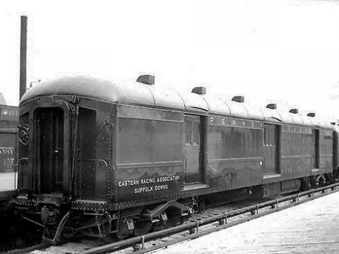 The PRR horse cars were class B74a/b. From the outside they looked like baggage cars except they had 3 doors per side and a pair of stalls on either side of the doors to transport twenty-four horses maximum. The PRR named all the cars; Atlantic City Racing Association, Aqueduct, Dell Mar Turf Club, Metropolitan Jockey Club, etc. | ![]() DD1 #340 in Tichy Scheme - PRR B74b horse express car "Brandywine Stables" near Jamaica 1950 Archive: Dave Keller |