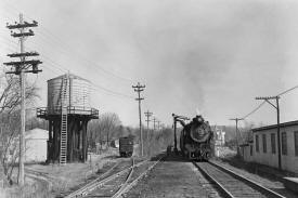![]() Also laying up in the West Yard, at the west end near the ashpit tracks is G5s #32. This c. 1935 view, looking northeast, was photographed just a short distance east of where the yard branched off the main, and was, for a number of years, adjacent to a turntable, which was later replaced bye a wye track located east of the station and south of the yard. (Dave Keller archive)