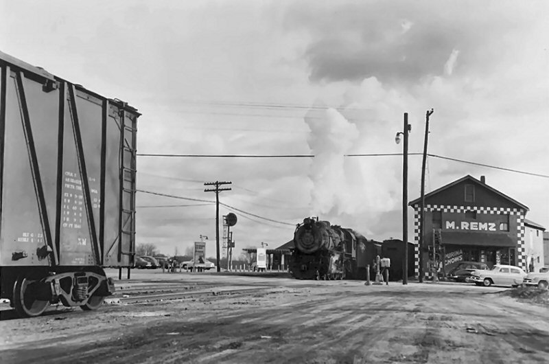 ![]() Looking due east in the West Yard in 1957, we see ALCO RS3 #1554 laying up alongside a Fairbanks-Morse C-liner. In the distance at the right is M. Remz's Feed store, many years a landmark, with its notable "Checkerboard Square" pattern, which was Purina Chow's logo. In the left background is visible the original depot in use as a freight / express house and the 1903 depot beyond. For fun, compare this image side-by-side with Brainerd's 1878 image! (Jules P. Krzenski photo, Dave Keller archive) |
