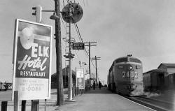 ![]() Fairbanks-Morse C-liner (model CPA24-5) #2401 is backing an RPO-Baggage car onto the wye east of the Port Jefferson station in 1955 so its train can head back west again. View is looking southwest. This area today is all built-up commercially. (W. H. Higginbotham photo, Dave Keller archive) |