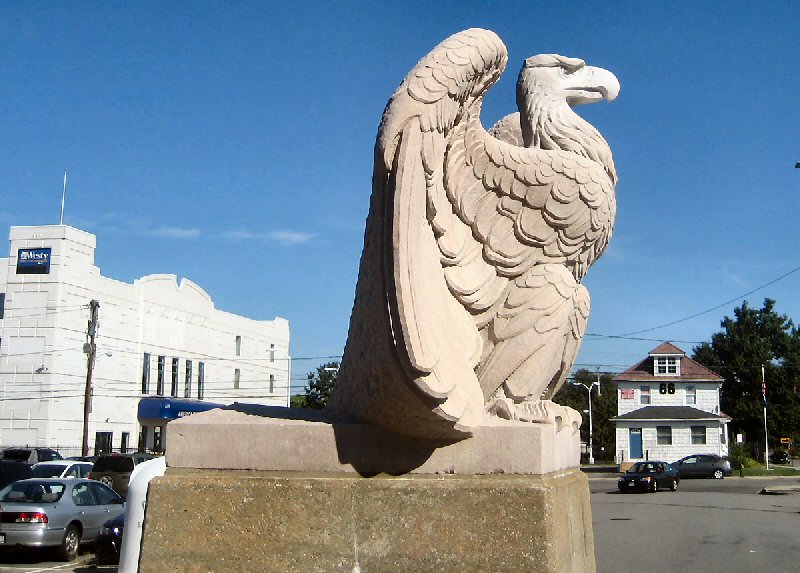 There are two at the US Merchant Marine Academy in Kings Point, NY. A nearby plaque identifies the eagles as being carved from Pink Granite quarried in Milford, Mass. Wrong, they are marble. |