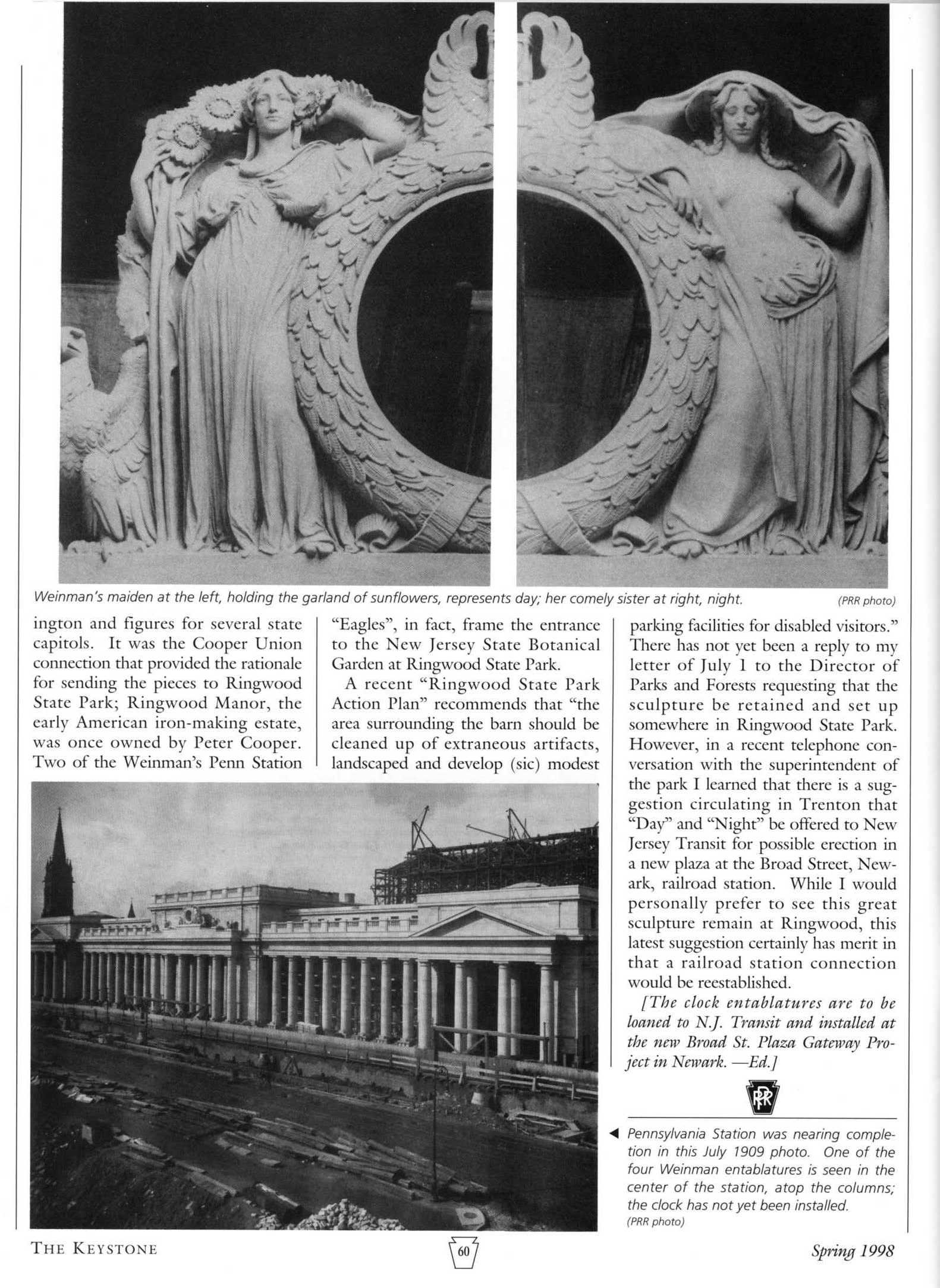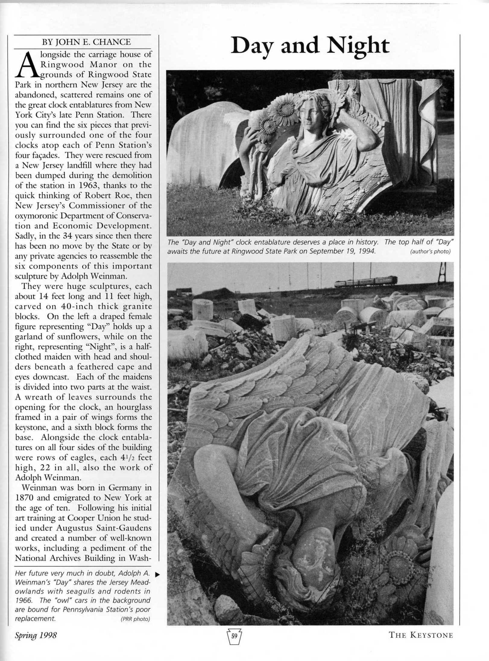 ![]() The NY TIMES pictured a "Figure of Day" in the New Jersey Meadowlands dump. This DAY would account for the third figure known to exist. The two previously known DAYS were in the statuary groups in Kansas City and Ringwood State Park, NJ (now at the NJT Newark Training Facility) so it appears that all figures of DAY have been accounted for. March 25, 1998 NY TIMES |