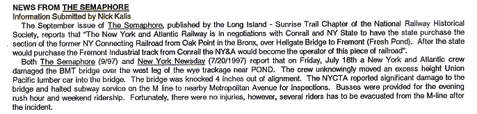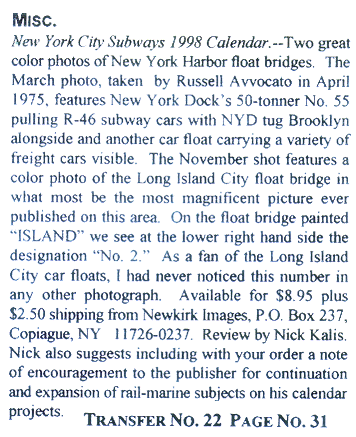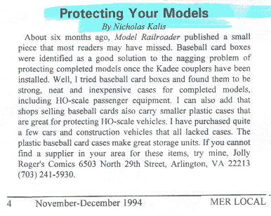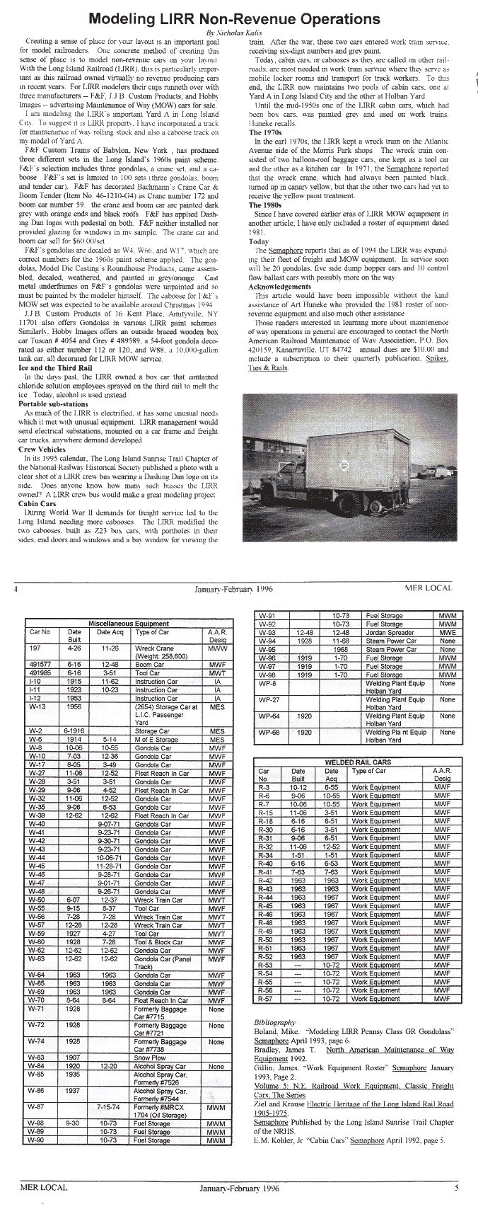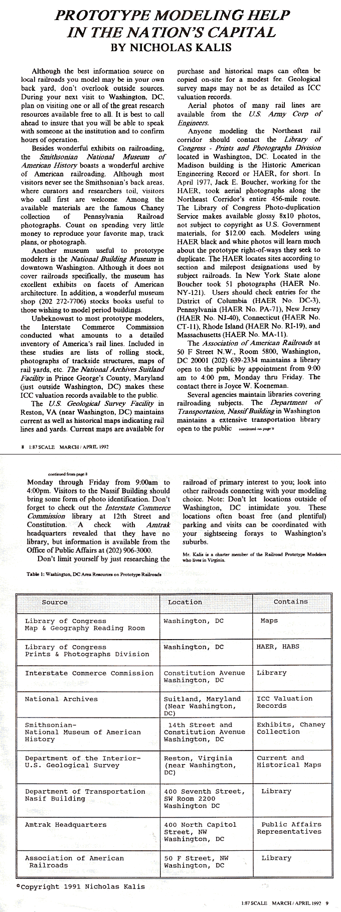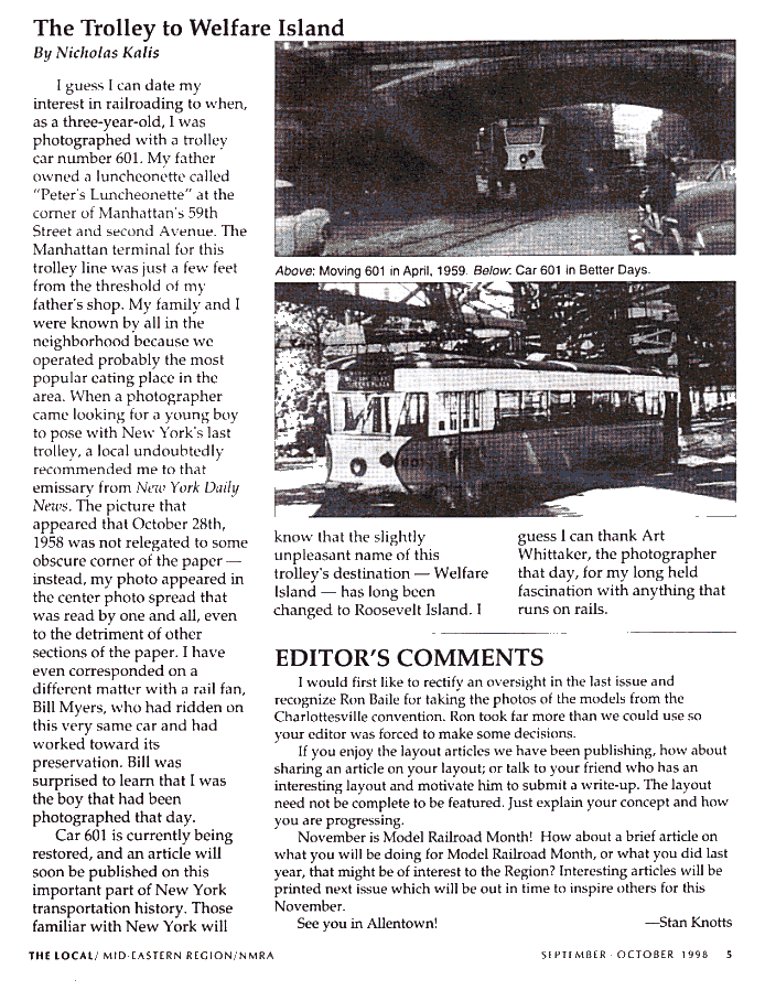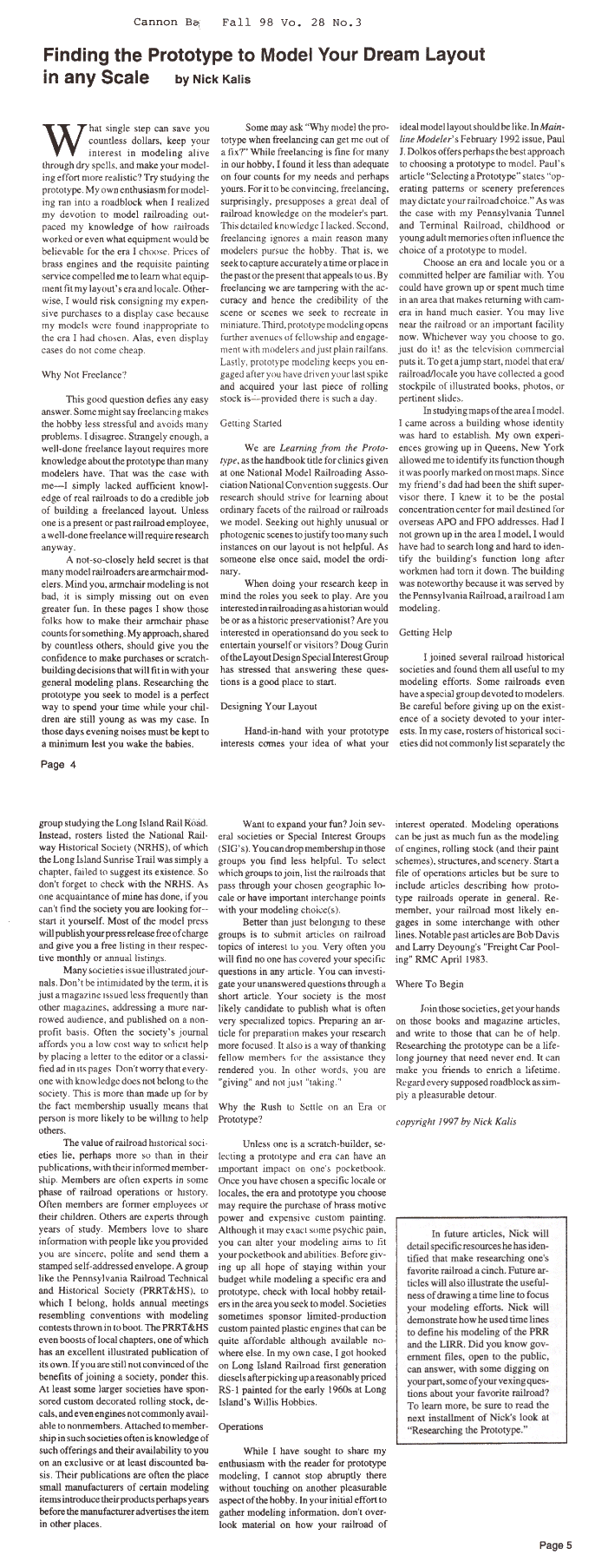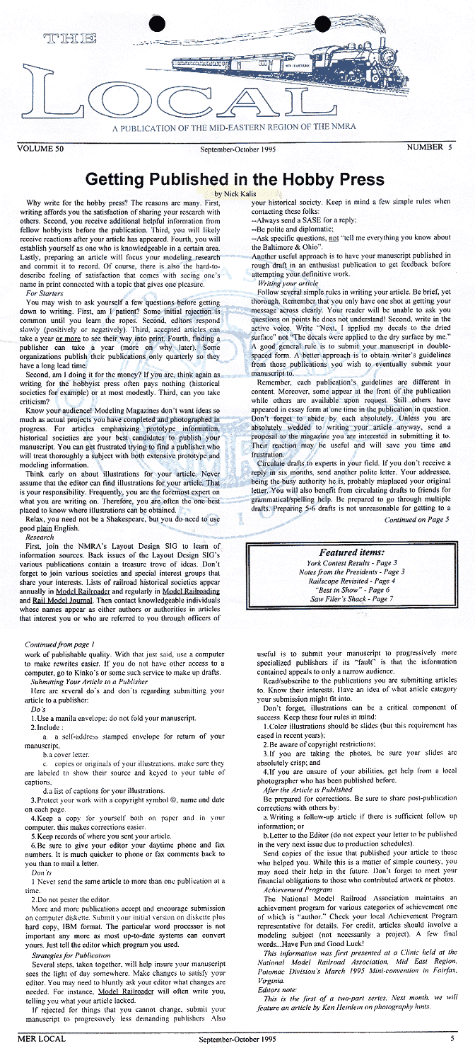 “Adventures in Urban Model Railroading.” N Scale Railroading March/April 2003: 30-37. A Review for The Cannonball “A Quick Start to Using Situation Cards for Your Layout.” Cannon Ball, Summer 1998 Vol. 28 No. 2, 4. “ABCs of Electric Railway Dates.” NMRA Bulletin, May 1992, 23-24. “A Fast Start to Operations.” Cannon Ball, Hint #8 “A Great Source of Scratchbuilding Supplies in the Potomac Division.” The Potomac Flyer, 2001 , 6. “A Great Source of Scratchbuilding Supplies in the Potomac Division.” The Potomac Flyer, 2002 , 11. “A Visit to the Suitland Archives - A modeler's Paradise.” Semaphore, February 1995, 6-7. “A Whiff of the Long Island – Pennsylvania Glory, Volume 1” The Transfer, No. 20, 27. “Amtrak’s Sunnyside Yard as Seen in January 1961.” (Photo) The Observation Car, Winter 1998, 3. “An Old Friend Needs Help” Trolley Talk, May-June 2001 Issue No. 254, 14-15. “Answer and photo, 60th Anniversary Survey.” Model Railroader, February 1994, page unknown. “Arch Street Freight House Operations” Dispatcher’s Office 2002 “Book review, Building the Independent Subway.” Transfer, No. 14 (April-June 1995), 36. “Book review, Long Island Railroad 1955 (sic) Calendar.” Transfer, No. 16 1995, 18. Correction published in next issue. “Building Mockups” The Potomac Flyer, November 2002-January 2003 (Winter Quarter), 3. “Designing a Layout for Video” “Details I wish to Model” Urban details by Scott G. Perry “Feedback on Dominoes?” Layout Design Journal, Vol. Unknown, 27. “Finding the Prototype to Model Your Dream Layout in Any Scale.” The Cannonball, Vol. 28, No.3 Fall 1998, 4-5. “Getting Published in the Hobby Press.” The Local, September-October 1995 Volume 50, Number 5. “Getting Started With Your Benchwork.” The Potomac Flyer, 2001, 8. Discusses Colonial Hardwoods “Getting Started With Your Sectional Benchwork.” The Potomac Flyer, 2001, 8. Discusses Ed Bjarnason “Getting Started With Your Track Plan.” The Potomac Flyer, 2001, 8. “I Built it Myself.” The Potomac Flyer, 2000, 11. “Improving the Appearance of Ready-To-Run Vehicles.” The Cannonball, 1998, 5. “Inexpensive Ballast.” The Potomac Flyer, Fall 2001, 8. “Intimidation.” The Potomac Flyer “Layout Tour: Hooch Junction Railroad.” Railmodel Journal, August 1992, 44-49. “Letter to the Editor.” (postscript to B-1 article) Mainline Modeler, November 1994, 16. “Letter to the Editor.” Lineside, Vol. XI, No. 4, 24. Poses question on Van Iderstine “LIRR Freight Sidings Along Yard A.” Lineside, Vol. XI no. 1, 5-6. “LIRR Parlor Cars in HO Scale.” Semaphore, September 1995, 6. “Long Island City Float Yard” The Keystone, Vol. 26, No. 2, Summer 1993, 54-62. “Long Island City Float Yard Operations.” Tug Bitts, Vol. III, No.1, page unknown. “Long Island City Float Yard.” The Transfer (published by Rail/Marine Information Group) No. 10, 1994 “Long Island Float Yard Operations, An Update, 5/94.” The Transfer, No. 11 July - Sept. 1994, 5. “Long Island Diesels in the North Shore Yards during the 1960s.” NMRA Bulletin, August 2001, page unknown. “Long Island RR Interlockings, “M” and “Bliss”.” Clear Block, Winter 200 Vol. 5, No. 2, 9. “Magazine Reviews.” The Hell Gate Connection, Volume 2, Number 3, 4. “Memories of The New York Connecting Railroad.” The Connecting, Vol. I, No. 12, 2. “Model Railroading and Baseball Cards.” The Potomac Flyer, Winter 1994/95, 4. “Model Railroad Priorities.” The Cannon Ball, Summer 2002 Vol. 32, No. 2, 3, 6. “Model Railroads That Have Influenced Me.” “Modeling Industries on the Long Island Railroad.” The Semaphore, June 2001, 6. Covers Louis Sherry. “Modeling Industries on the Long Island Railroad.” The Semaphore, June 2001, 7. Covers National Casket. “Modeling LIRR Non-Revenue Operations.” MER Local, January-February 1996 Vol 51, Number 1, 4-5. “Modeling LIRR Operations.” Semaphore, October 1993, 9. “Modeling LIRR Reacher Cars, The Long Island Railroad Modeler.” The Semaphore, June 2001, 5-6. “Modeling the LIRR” The Potomac Flyer, August 2002 – October 2002 Fall Quarter, 11. “News from the Semaphore.” Semaphore, September 9, 1997. “Obtaining Data From ICC Railroad Valuation Records.” Semaphore, May 1995, 6. I edited this material. “Operating Sunnyside Yard in the ‘60s.” The Dispatcher’s Office, April 1997, 13. “Potomac Division Layout Tours.” The Potomac Flyer, 5. “Product Review LIRR C-Liners.” The Cannonball, Summer 1998, 4. “Protecting Your Models.” MER Local, November-December 1994, 4. “Prototype Modeling Help in the Nation's Capital.” 1:87 Scale (Published by Railroad Prototype Modelers), March/April 1992, 8-9. “Prototype Modeling's Overlooked Research Tool.” Model Railroading, May 1993, 38. “PRR B-1 Switcher.” Mainline Modeler, July 1994, 25-29. “Replicating Scenes and Jobs from the 60s – Long Island Railroad in HO.” Layout Design Journal, Winter 2000, LDJ-23, 18. “Reviews”, a number of books and articles published of interest. Urban Modelers Newsletter. “Review New York City Subways Calendar 1998.” Transfer, No. 22, 31. “Rome Was Not Built In A Day.” submitted to The Potomac Flyer “Schaefer Creek Coal Company”, N-Scale November/ December 1991, pp.41-42. “Selecting and Installing Caboose Ground Throws.” The Potomac Flyer , February 2002 –April 2002, Spring Quarter, 4. “September Swap Meet Goes Well But Underattended.” The Potomac Flyer, Nov 1999 – Jan 2000, Fall Quarter, 1. “Sunnyside: The World’s Greatest Passenger Railroad Yards. ” Keystone, Vol. 29, No. 1, Spring 1996, 15-62. “Sunnyside Yard in HO Scale.” Rail Model Journal, July 1998, 26-37. “The Lighter Side.” The Potomac Flyer February 2002 –April 2002, Spring Quarter, 3. “The Search for Pliobond.” The Potomac Flyer, Spring? 2001, 8. “The Trolley to Welfare Island.” 