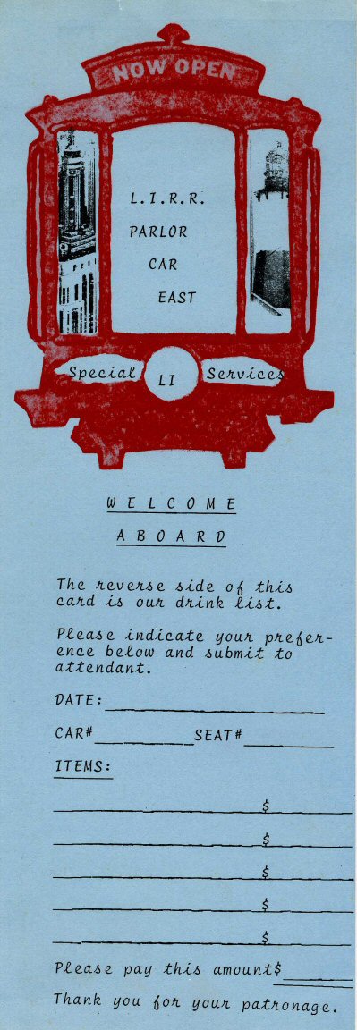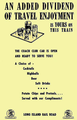 If I stayed on the train to Port Washington, I'd have to wait hours until the next westbound headed back, so it was advised that I wrap up quickly and get off at Auburndale. That way, it was only a short wait for the next westbound to take me back to the Penn Station commissary. I'm all wrapped up. I've untied my bar cart from the vestibule support posts and have the cart rolled out into the vestibule of the M1. The train makes the station stop and I get off at Auburndale, only to find that now it's dusk and I'm the ONLY ONE standing on the entire station platform which was poorly lit. I'm a visible target with booze, beer, and all my cash and the neighborhood was pretty bad around the station then . . . I can imagine how much worse it is today! I have to say I breathed a sigh of relief and a "thank you LORD!" when the westbound made the station stop and I loaded old Betsy on board!!! I vowed that if I ever was assigned that trip again, I'd work it to Port Wash and just wait around. At least I could wait in the depot with personnel around. But had I done that, I'd have more problems as the commissary would be closed by the time I got back and I'd be sitting with the cart on the Penn Station platform until morning. I luckily never got assigned another Port Wash train. A similar situation was when I worked the bar car to Speonk. If you got off at Speonk, where your train terminated, you waited a few hours for the next train west, having passed the earlier westbound as you were headed east. So it was suggested by the senior bar man we get off at Mastic-Shirley, which we did. The westbound train still ran ahead of us, so we walked the 2 blocks to Montauk Highway, carrying our cash (booze, etc. were locked up on board the bar car) and sat on a bus bench as visible targets until we caught the westbound Road n' Rail bus to Patchogue. The senior guy took the train from Patchogue to wherever he got off and I got off and headed home after my father picked me up at the station. I waited safely in the trainmen's room in the station. Luckily the only problem we faced at Mastic-Shirley was finding out the Road n' Rail bus didn't honor LIRR passes, so we had to shell out the fare which was not refundable. I never got assigned another Speonk run after that, either . . .thank GOD! Montauk runs only in Bar car/Parlor service and Babylon branch runs in bar cart service. |