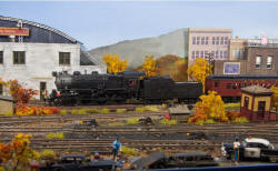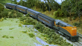 ![]() An LIRR train of MP54s is shown crossing the small timber trestle near the lighthouse, and will shortly be arriving at the Eastport station. ![]() LIRR H10s 105 (a brass import) is crossing the high bridge over Chatham Gorge with a string of loaded hopper cars. |
