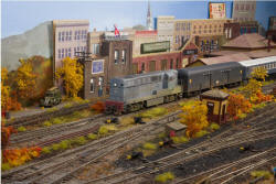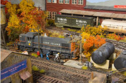 ![]() LIRR Baldwin DS4-4-660, 412 is shoving an empty flatcar onto the Jackson Transfer pier in the town of Eastport. (Custom painted Stewart product) |