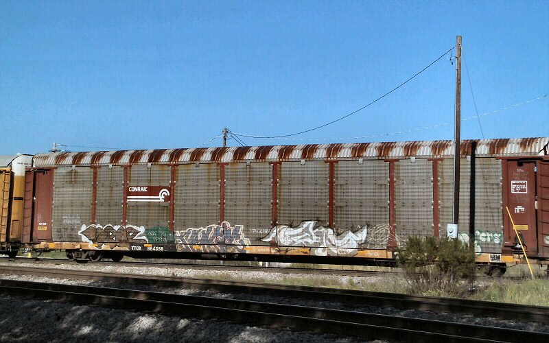 Auto rack graffiti on almost every car in this 100+ car unit train.