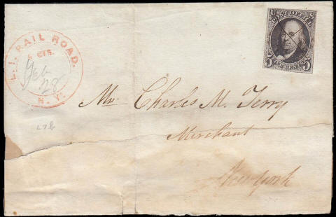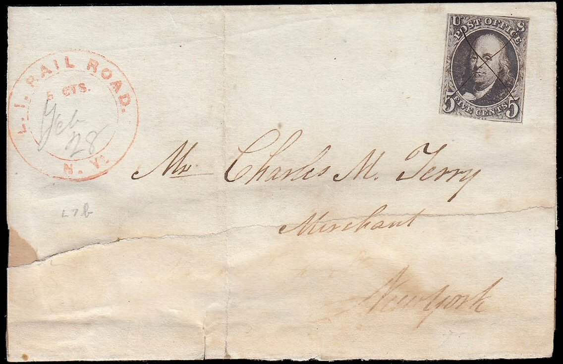 LIRR stampless cover with brown ink circular hand stamp L. I. RAIL ROAD postmarked 7/26/1850.